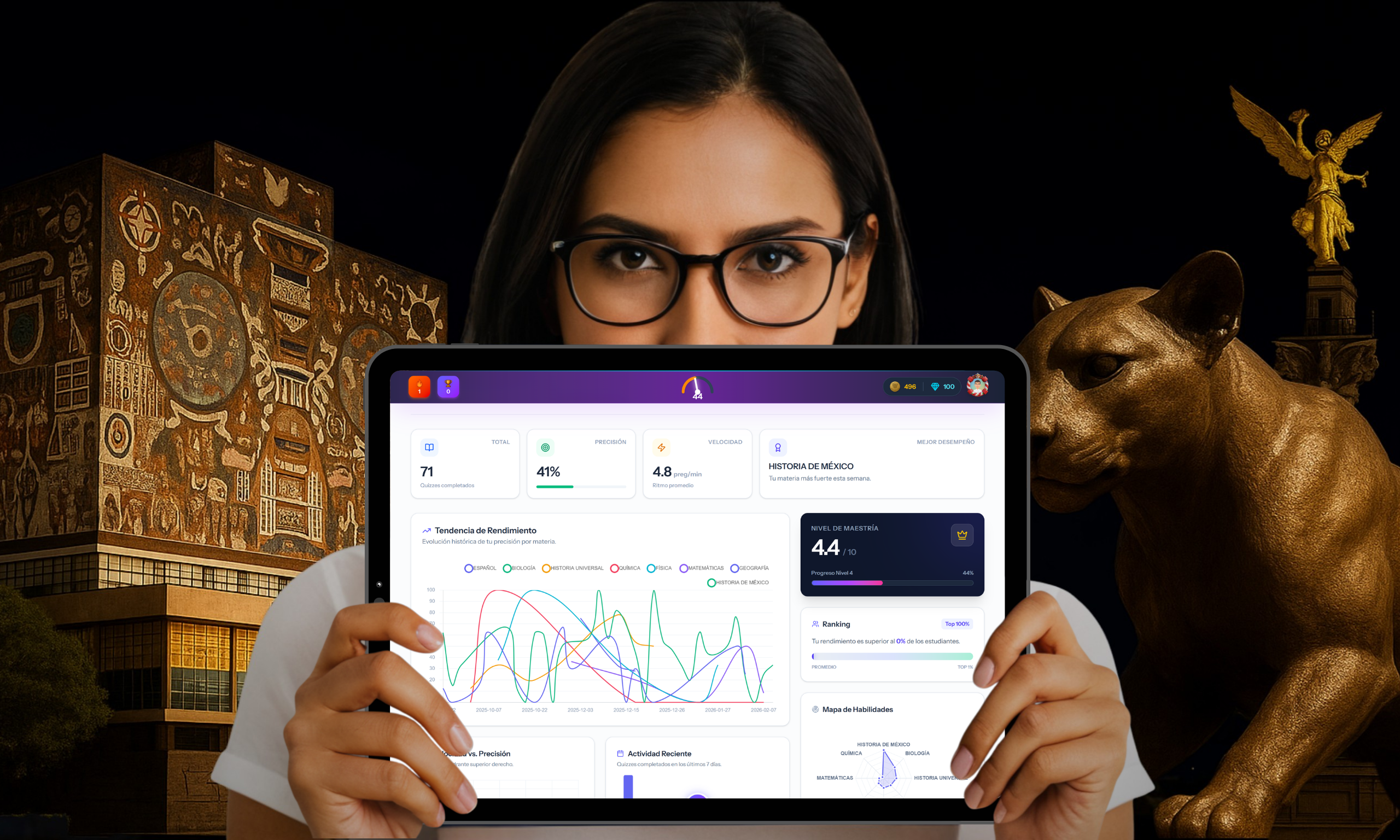 Nuestra plataforma con IA se adapta a ti, identifica tus debilidades al minuto y crea rutas de estudio personalizadas.